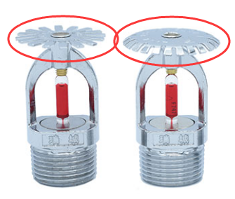 那么怎么分別噴淋頭是上噴還是下噴呢?這其實很簡單,就看濺水盤。濺水盤向玻璃球有彎曲弧度的是上噴,濺水盤是平面的是下噴。如上圖左邊的下噴,右邊的上噴。