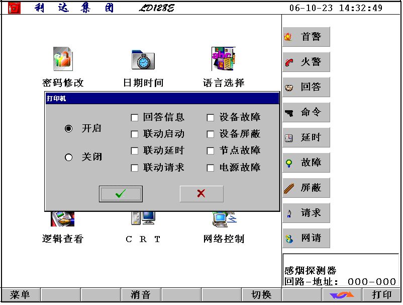 利達(dá)128E II火災(zāi)報(bào)警控制器在本頁(yè)可完成打印機(jī)的操作。畫面下方顯示打印機(jī)當(dāng)前狀態(tài)。